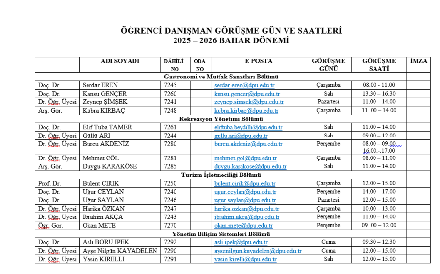 Danışman Gün ve Saatleri